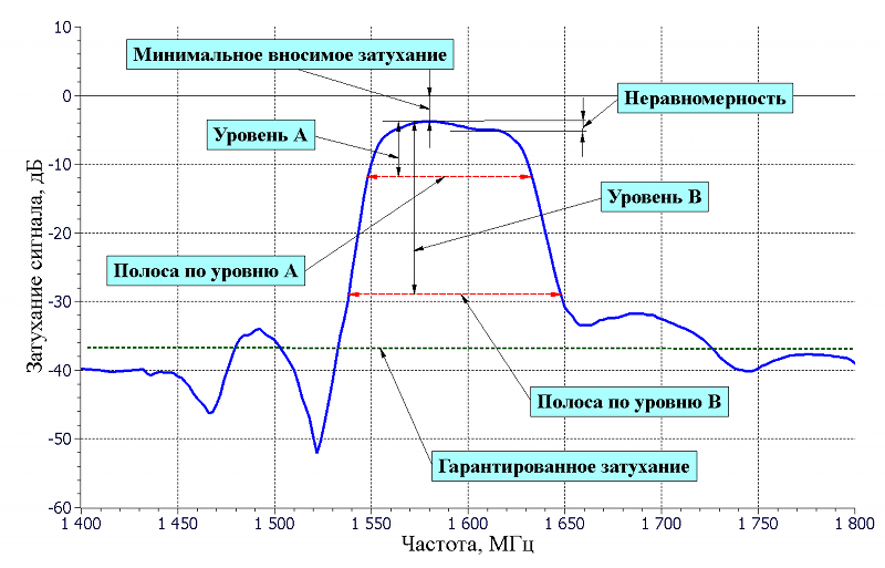 Рис. 1. Типовая АЧХ фильтра на ПАВ